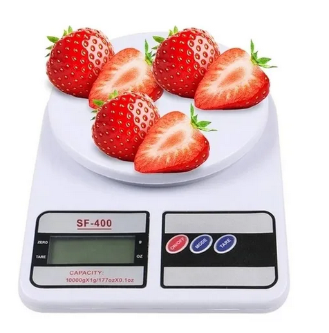 CARACTERÍSTICAS: - Indicador digital; - Capacidade máxima de 10.000g em divisões de 1g; Teclas Funcionais: -ON/OFF (Liga/Desliga a balança) -MODE (Seleciona a escala gramas ou onças) -TARE (Elimina o peso do recipiente que devem ser desconsiderado do peso total. Ponha o recipiente e tecle TARE, a balança zera. Acrescente o que deseja pesar dentro do recipiente e obtenha o resultado somente do produto acrescentado)