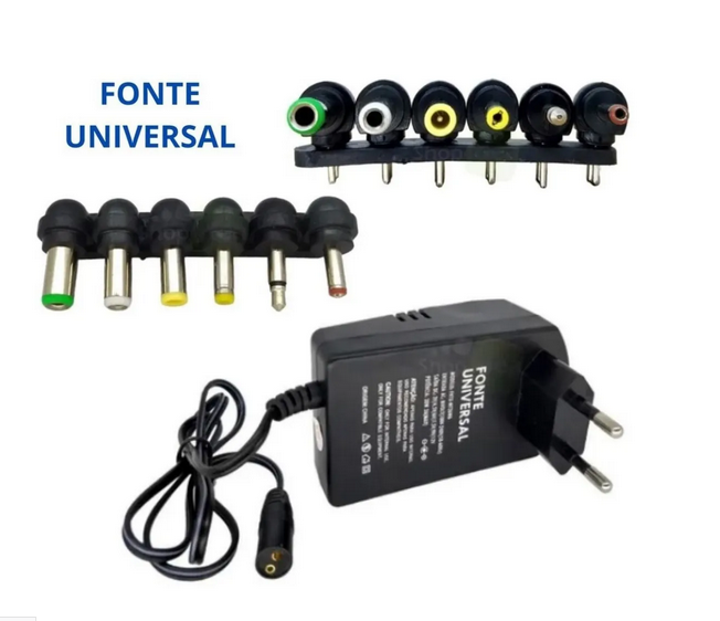 FONTE DE ALIMENTAÇÃO UNIVERSAL REGULADA 3.5A 7 PLUGUES BIVOLT 42W PRETA Fonte de alimentação regulada universal com 7 plugues, indicada para: Notebook, Laptop, Telefone sem fio, câmera fotográfica, roteador, entre outros. INFORMAÇÕES DO PRODUTO: Entrada: 100V – 240V AC. Saída: 3 / 4.5 / 6 / 7.5 / 9 / 12V DC. Potência: 42W. 3.5A – 7 Plugues. Cor: Preto. CONTEÚDO DA EMBALAGEM: • 1 Fonte de alimentação universal regulada.
