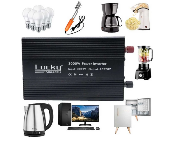 O inversor LUCKY AMAZÔNIA 3.000w 12v 220v onda senoidal Modificada suporta aparelhos até 900w e com picos de até 6.000w. Verifique se a potência do equipamento é compatível com as informações oferecidas, certifique-se de que a entrada (12v) e saída (220v) são as corretas para seu uso. Em caso de dúvidas utilize o campo de perguntas para que possamos auxiliar na sua compra. A instalção do produto deve ser feito por um profissional com conhecimento técnico para que não danifique o produto nem o que será ligado nele