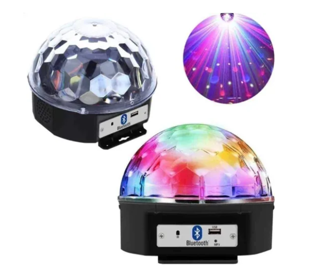 LED BOLA DE CRISTAL MÁGICA Globo de Luz Led Magic Cristal Ball Light possui em seu interior 6 leds de 18W de potência, proporcionando uma linda iluminação holográfica. Seu domo transparente foi especialmente projetado para criar feixes de luzes fortes e condensados ao mesmo tempo, iluminando o ambiente. Possui 90 lentes em seu domo colmeia gerando incríveis 540 pontos de feixes luminosos. Este Globo tem várias funções: modo colorido, formações holográficas automáticas, efeitos mistos de desenhos, single e sensor de som interno que acompanha a música que estiver tocando na bola maluca via pen drive ou bluetooth. Tensão: 110/220V ( Bivolt) Consumo: 18w Ângulo: 138º Potência: 6 leds Cores: Azul, Laranja, Roxo, Verde e Vermelho e Branco Tamanho: 18 x 18 x 16 cm Peso: 0,9 gramas
