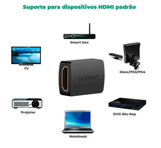 O adaptador HDMI 2.0 fêmea-fêmea da UGreen possui ampla compatibilidade e permite que você converta uma interface HDMI fêmea em macho, com alta velocidade de conexão e transmissão.